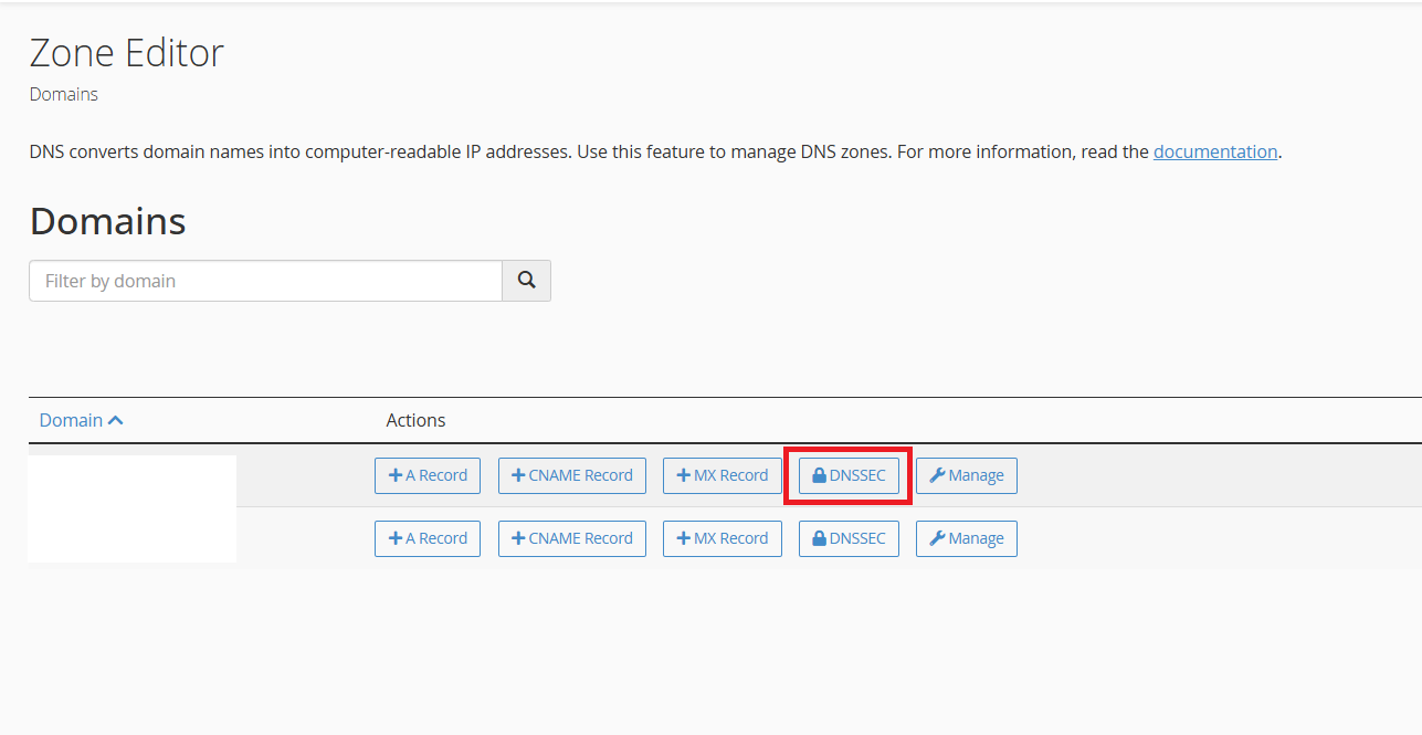 1. DNSSEC-ის დასამატებლად საჭიროა DNSSEC-ის მონაცემების დაგენერირება ჰოსტინგის მხარეს. თუ ჩვენთან გაქვთ ჰოსტინგი, მართვის პანელში cPanel გადადიხართ Zone Editor-ში და ირჩევთ DNSSEC-ის მენიუს და აგენერირებთ მონაცემებს.