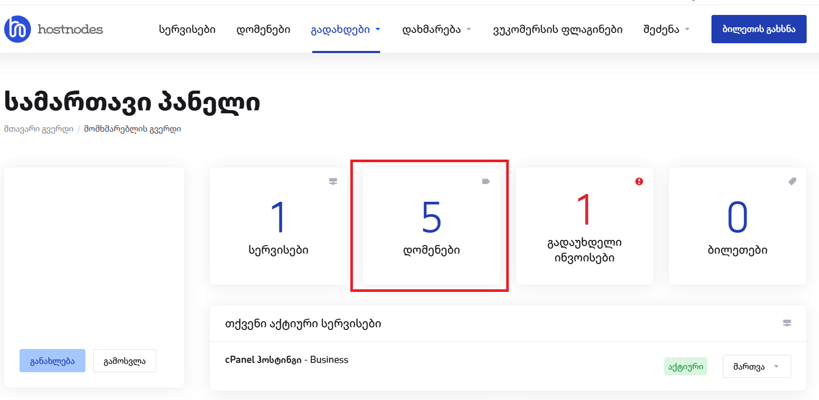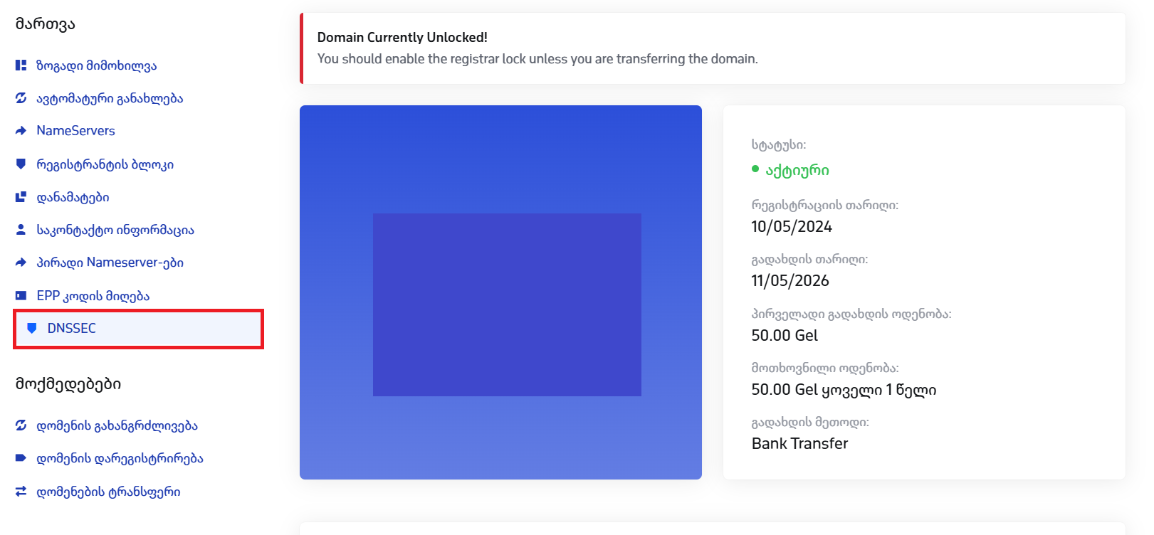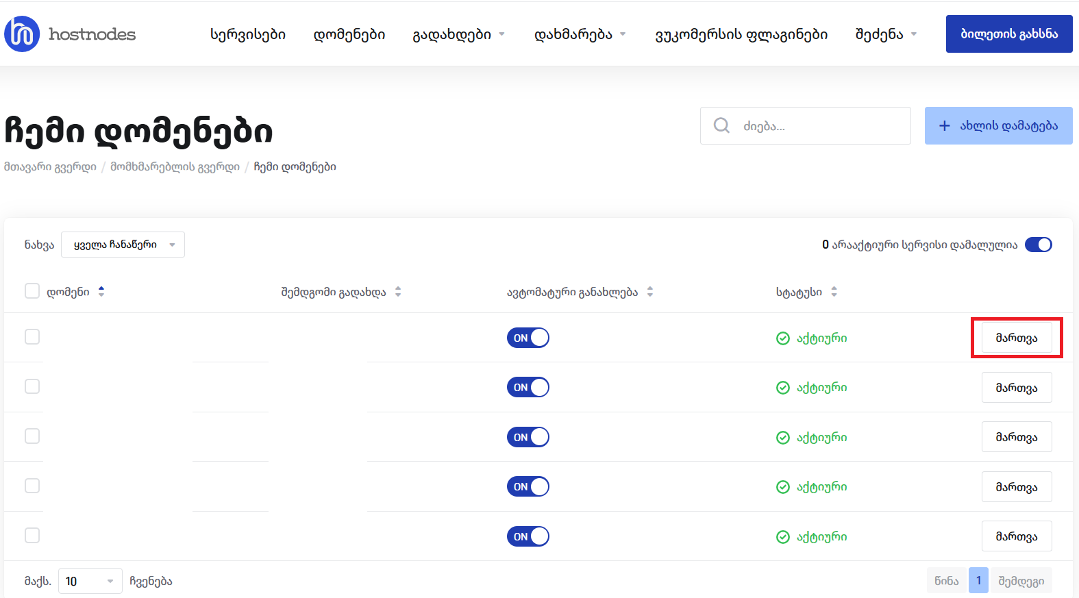 2. DNSSEC-ის დასამატებლად დომენზე, პირად კაბინეტში გადავდივართ დომენების განყოფილებაში