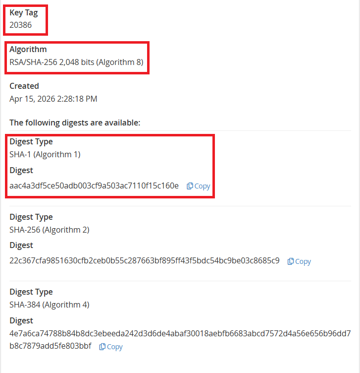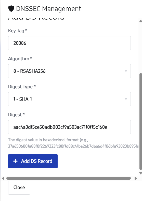5. შემდეგ ვავსებთ მონაცემებს იმის მიხედვით როგორც გვაქვს დაგენერირებული DNSSEC-ის ჩანაწერი ჰოსტინგის მართვის პანელში, მაგალითისთვის გამოიყენეთ ქვედა ორი სურათი.